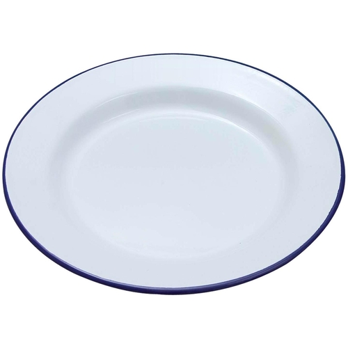 Traditional white enamel wide rim dinner plate ideal for kitchen and camping use. Scratch and stain resistant and suitable for temperatures up to 270c. This offers a stylish and retro additions to food and table presentation.